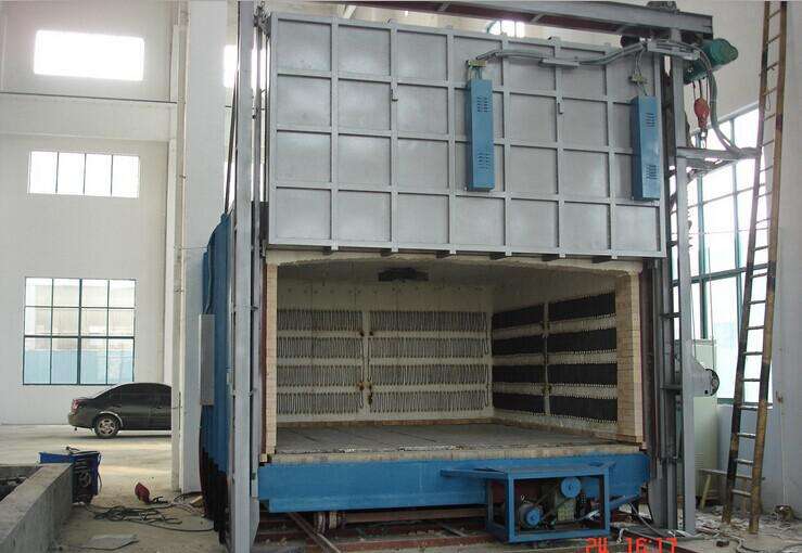 RT2系列臺車式電阻爐是周期式作業爐,CJN結構,采用纖維結構, 臺車爐采用復合式高鋁瓷釘組,臺車防撞擊密封磚,自動密 封臺車和爐門,一體化連軌,不需基礎安裝,放在水平地面即可使用。 大新臺車式電阻爐主要用于高鉻、高錳鋼鑄件、球墨鑄鐵、軋輥、鋼球、45#鋼、不銹鋼等淬火、退火、時效 以及各種機械零件熱處理之用。 RT2系列臺車式電阻爐適用于一般金屬零件在氧化性氣氛下進行正火、退火、淬火等熱處理加熱,尤其適宜大型鑄件、鋼帶、鋼卷等退火之用。 本系列臺車式電阻爐主要由爐殼、爐襯、爐門升降裝置、小臺車、加熱元件及配套電器控制系統等組成。 爐體外殼用冷扎鋼板及型鋼制作;罩殼室采用鋼板焊接制作。爐膛采用輕質耐火磚、托絲磚砌成,爐底采用輕質保溫磚和重質耐火磚砌筑,爐殼與爐膛內壁之間填充保溫材料。 加熱元件為高溫電阻絲安裝在爐膛的兩側、臺車和爐門上。爐門的升降采用機械傳動,通過馬達減速機帶動鏈輪鏈條傳動升降、壓緊爐門。 臺車采用型鋼焊接制作,上面用耐火磚砌成,臺車工作面上部裝有耐熱鋼爐底板,可承受較大負載、變形小。臺車的進出與爐門的升降,采用互聯鎖電動(機械傳動)控制,當爐門全部打開后臺車方能進出、否則臺車無法運行,起到安全保護作用,爐門外殼采用鋼板折壓成型焊接制作,內部采用高溫陶瓷纖維制作,操作輕便保溫效果好。臺車的進出通過AC馬達、減速機、鏈輪鏈條傳動帶動臺車前進后退。塑料泡沫與透明拉伸膜包裝。